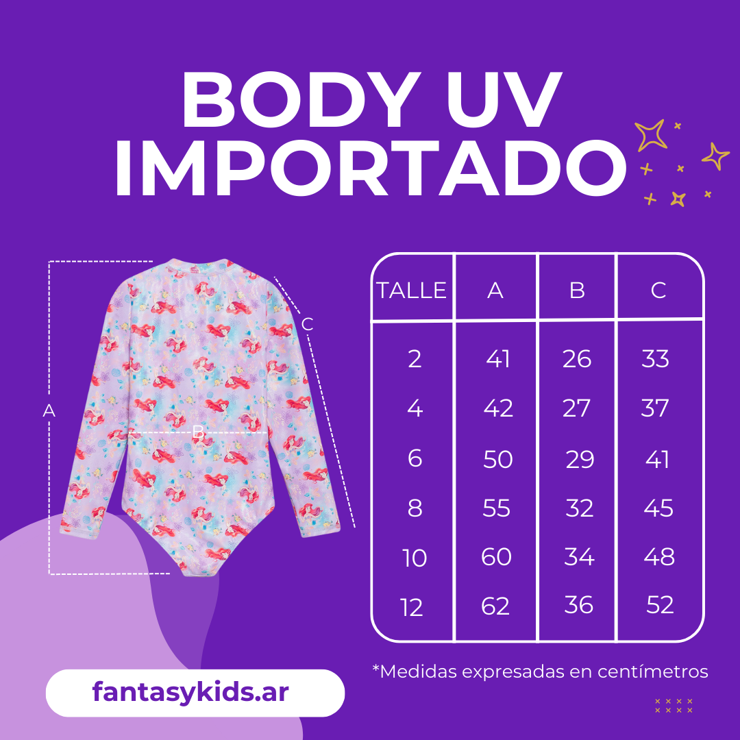 Nuestro body UV importado de Disney es la combinación perfecta de protección y diversión: bloquea el 98% de los rayos UV con certificación oficial, la más alta del mercado. Está confeccionada en 85% poliéster y 15% elastano, un material liviano, elástico y de secado rápido, para que juegue cómoda en la pileta, la playa o el club sin que vos tengas que preocuparte.