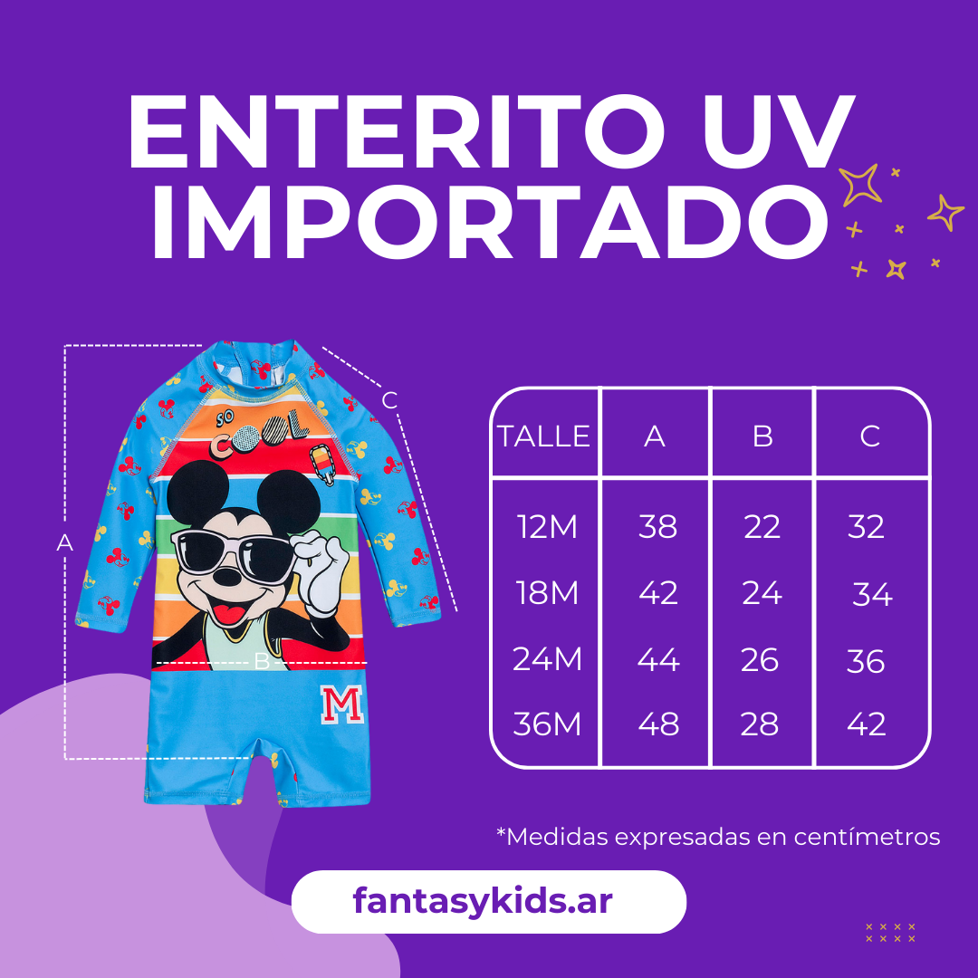 Este enterito UV importado de Mickey, con certificación oficial y la máxima protección solar del mercado: bloquea el 98% de los rayos UV. Está confeccionada en 85% poliéster y 15% elastano, un tejido liviano, flexible y de secado rápido, pensado para que los chicos se muevan cómodos y seguros sin que vos tengas que estar pendiente todo el tiempo.